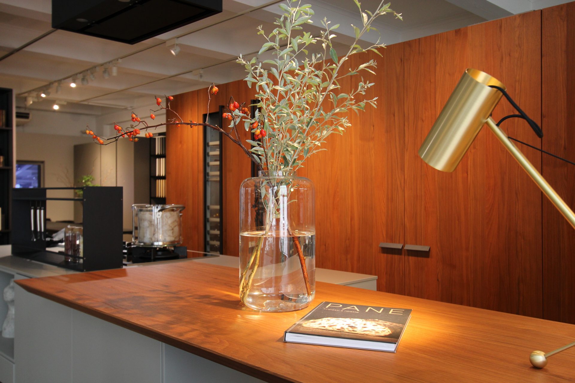 キッチンに直接花器を置くと、作業スペースが狭くなったり、火元の近くで危なかったりと色々懸念がありますが、こうしたちょっとしたテーブルが備わっていると、インテリアにも有意義に活用できます。