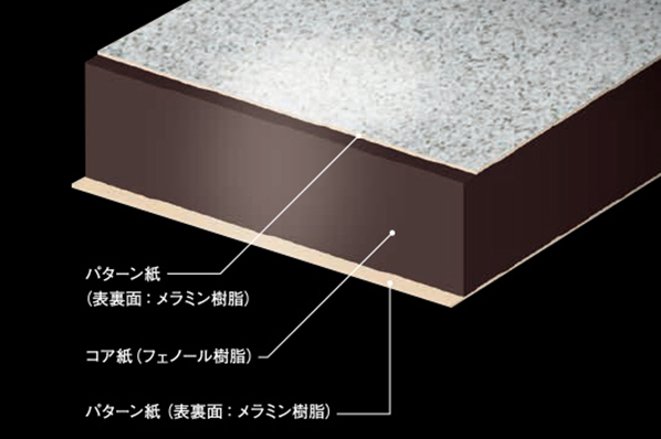 高圧メラミン化粧板は、メラミン樹脂、フェノール樹脂を含侵させた紙を何枚も重ね合わせて、高温高圧下で積層形成したプラスチック板を基材に貼っています。例えば高圧メラミン材の代表格としてAICAが挙げられます。