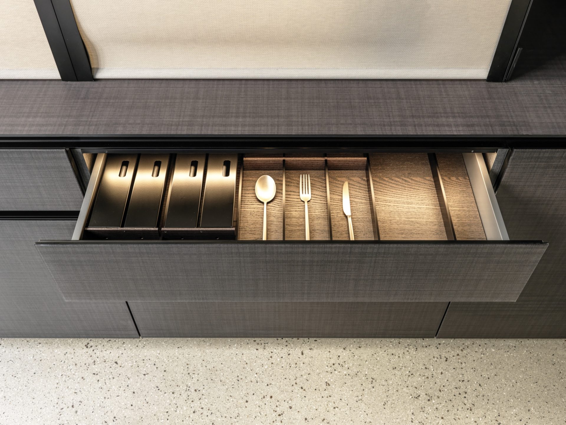 色味だけでなくツヤ感も思い通りにオーダーでき、木口まで継ぎ目なく滑らかな仕上がりはオーダーキッチンならではの高級感があります。