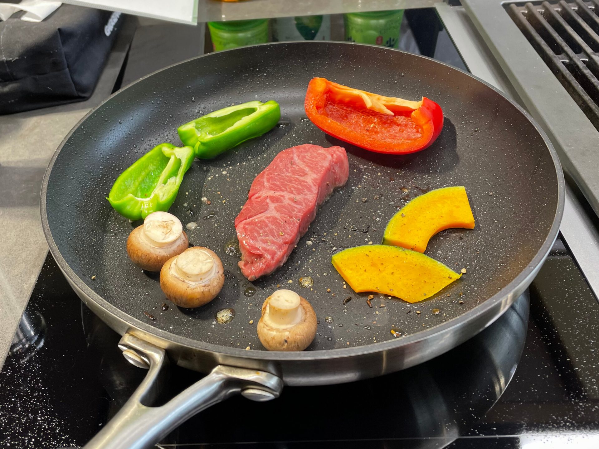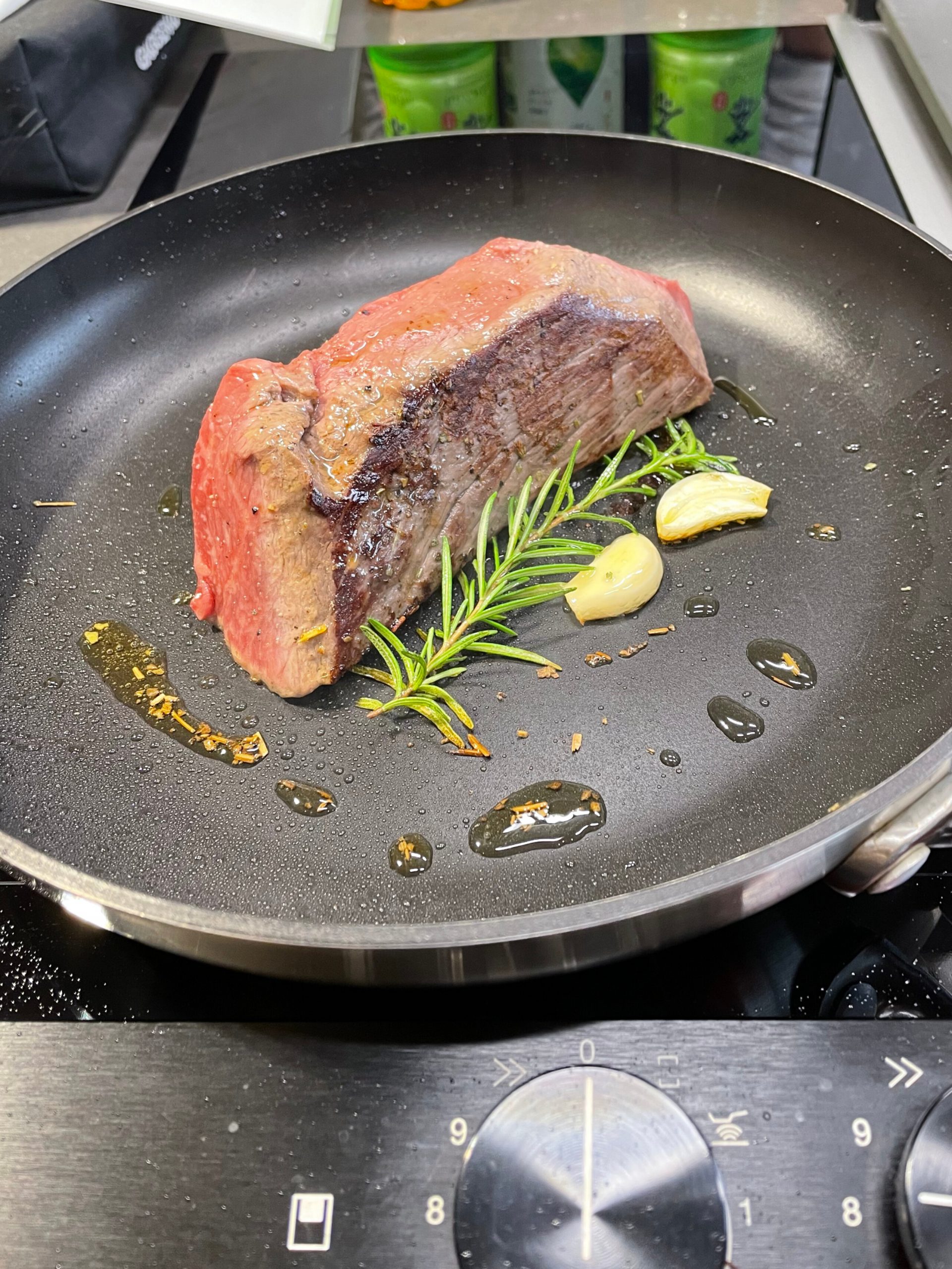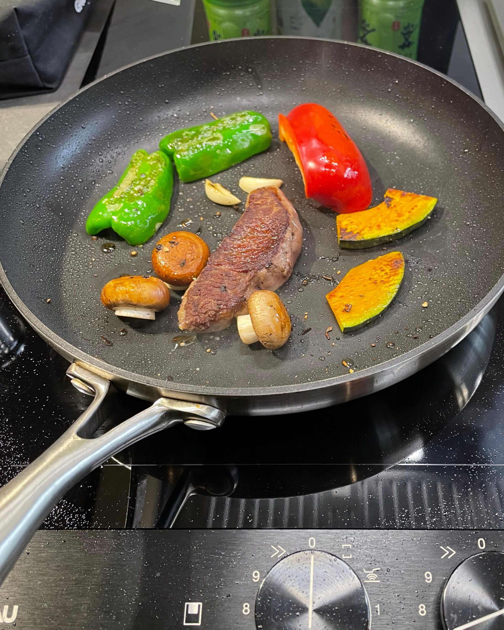 初めにフライパンで焼き目をつけて、スチームオーブンで火を通します。