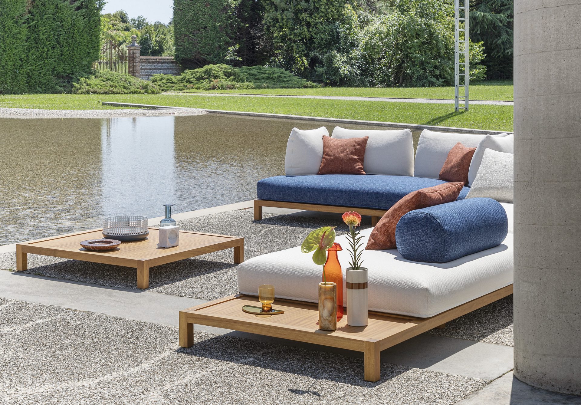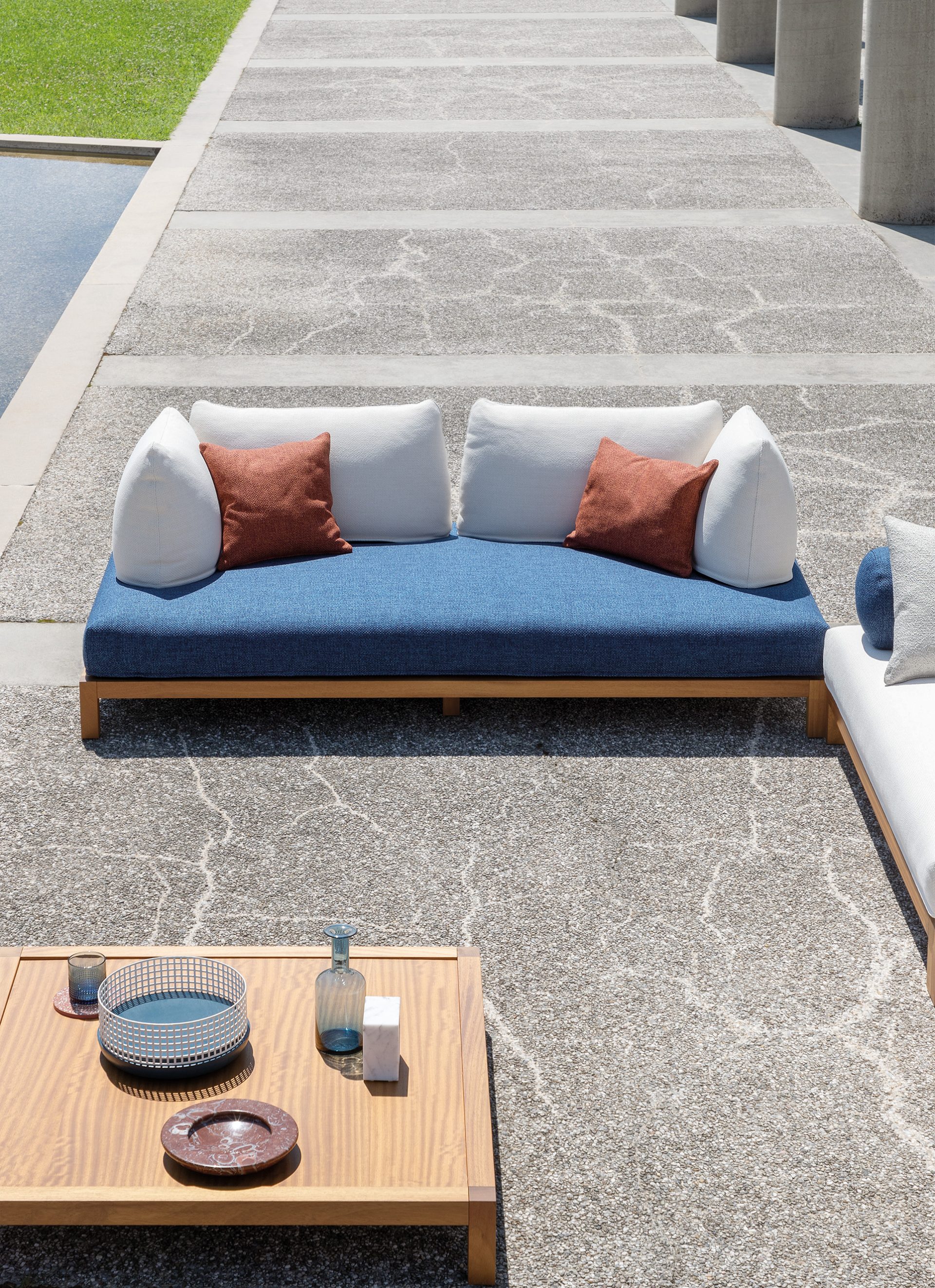 船舶などにも使われる高い耐久性のイロコ木材をソファベースに用いて、アウトドアユーズにも耐えうる仕様にしています。