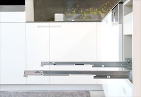 2. 左右方向レール下のレバーで調整します(左右両方にあります)レバーをキャビネット側に押すとロックが解除され、調整が出来るようになります。